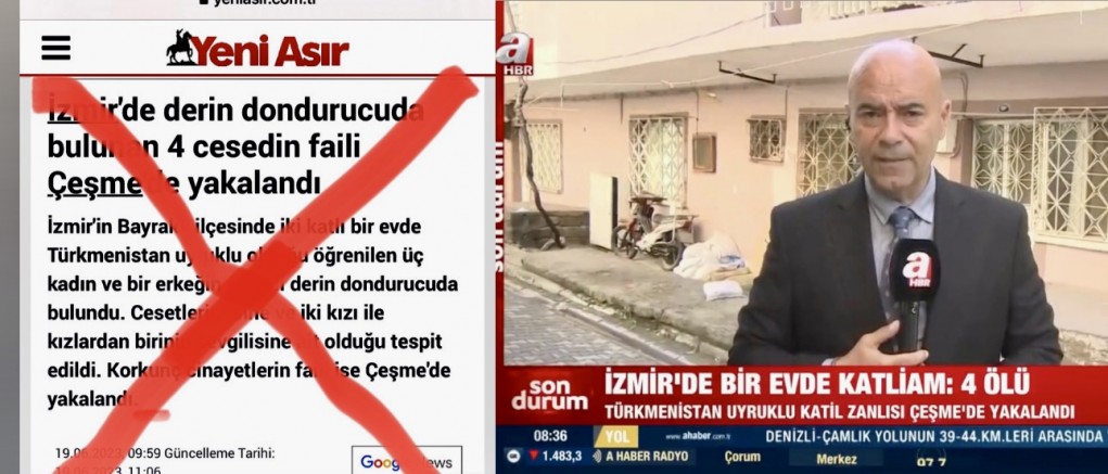Bayraklı’da bir evde Türkmenistan uyruklu 4 kişinin cesedi parçalanmış şekilde derin dondurucuda bulundu. Cesetlerin anne ve iki kızı ile kızlardan birinin sevgilisine ait olduğu tespit edilirken medyaya 'Katil Çeşme'de yakalandı' haberi medyaya yansıdı. Ancak Çeşme İlçe Emniyet Müdürlüğü'nden yapılan açıklamada haberin gerçeği yansıtmadığı ortaya çıktı.
