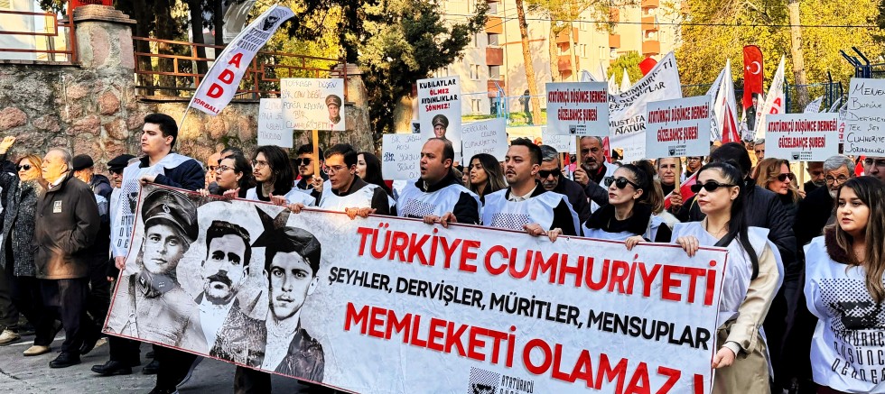 Tören öncesinde pankartlarla yürüyüş gerçekleştiren ADD üyeleri, “Türkiye laiktir, laik kalacak” sloganları attı.