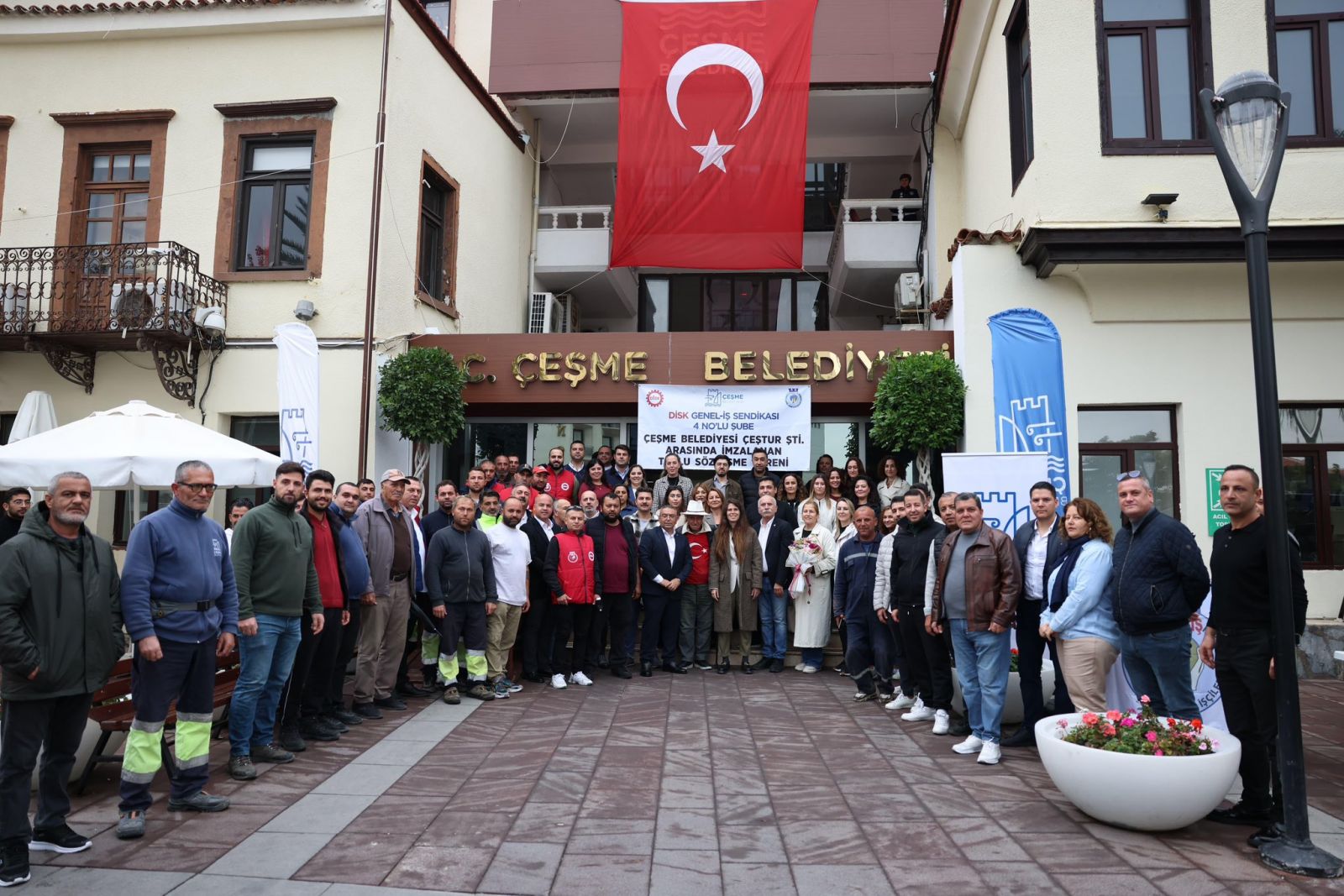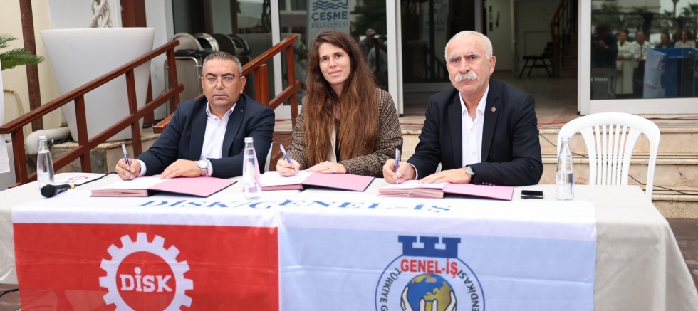 Çeşme Belediyesi, İzmir’de Türkiye Devrimci İşçi Sendikaları Konfederasyonu’na (DİSK) bağlı Genel-İş Sendikası ile ilk toplu iş sözleşmesini imzalayarak bir ilke imza attı. Geçtiğimiz cuma günü belediye tarafından sunulan teklifin işçilerin yüksek katılımlı “evet” oyuyla kabul edilmesi üzerine anlaşmaya varıldı. Bugün Çeşme Belediyesi önünde düzenlenen imza töreniyle kutlandı.