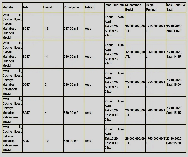 İhaleler 23 Ekim 2025 Perşembe günü Çeşme Belediyesi Meclis Salonu’nda yapılacak. Her taşınmaz için farklı saatlerde teklifler alınacak.