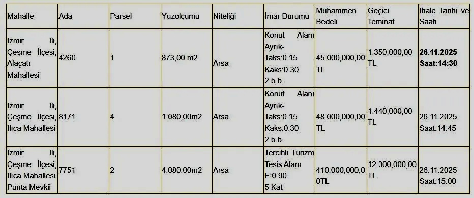 Çeşme Belediyesi, Alaçatı ve Ilıca’da bulunan 3 arsayı toplam 503 milyon TL bedelle satışa çıkardı. İhaleler, 26 Kasım 2025 tarihinde Belediye Meclis Salonu’nda gerçekleştirilecek.
