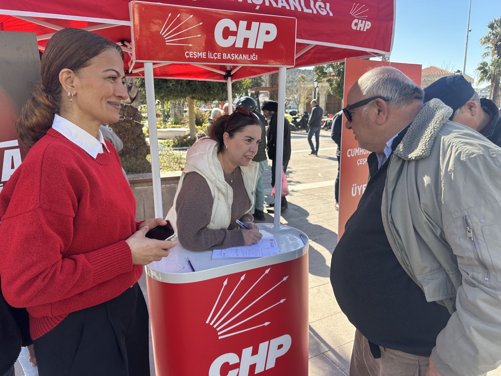 Üye standında çok sayıda vatandaş CHP’ye üye olurken, bazı vatandaşlar da yaşadıkları ekonomik sıkıntıları ve taleplerini partililere doğrudan iletme fırsatı buldu. CHP Çeşme İlçe Yönetimi ve Kadın Kolları, broşür dağıtarak partinin çözüm önerilerini paylaştı.