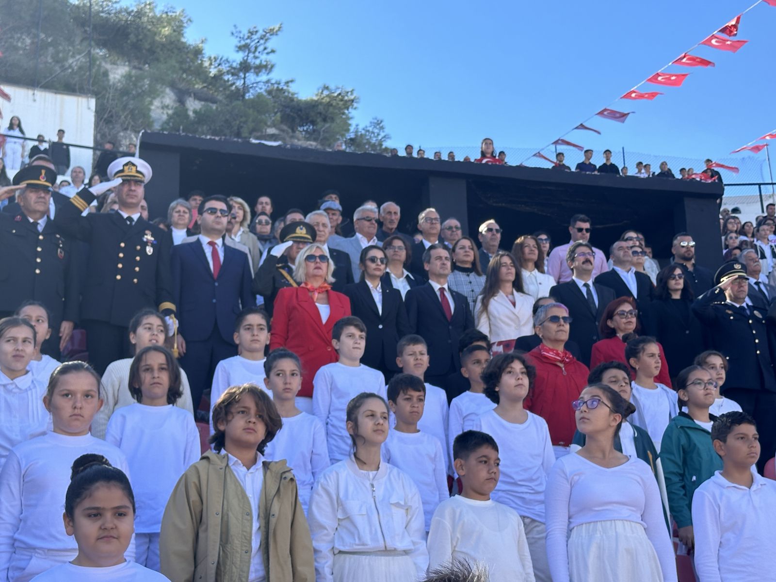 Kaymakam Mehmet Maraşlı, Belediye Başkanı Lâl Denizli ve Garnizon Komutanı Albay Erol Dağdeviren, tören alanında öğrencileri ve vatandaşları selamladı.