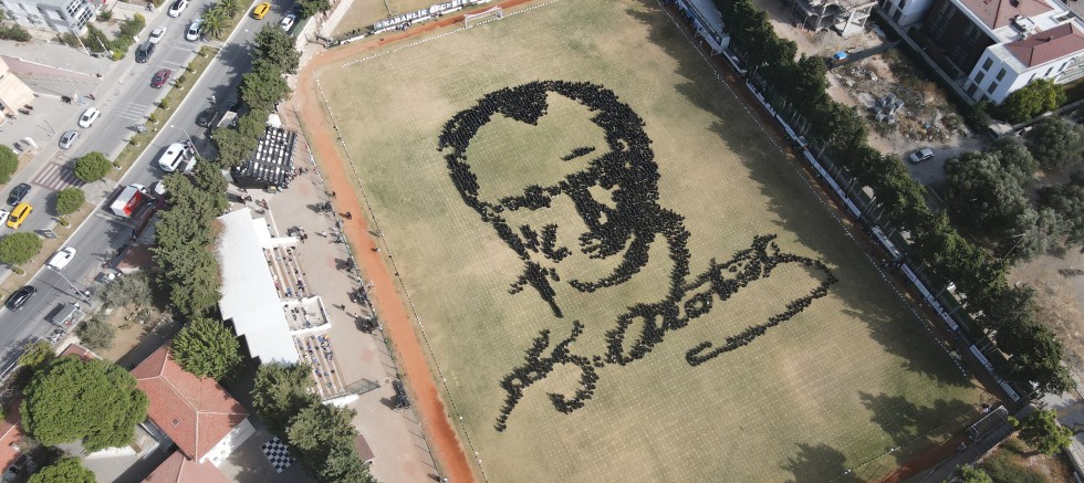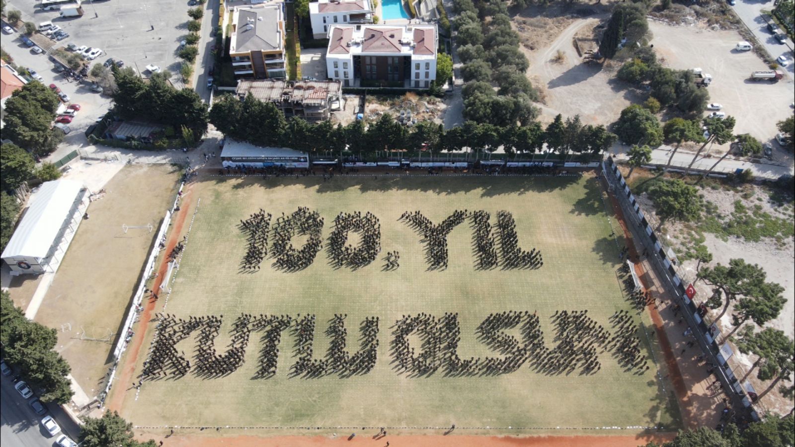 Çeşme’de 4 bin öğrenci bir arada Harmandalı zeybeği oynayarak, hem Atatürk silueti ile imzasını resmettiler hem de Cumhuriyetimizin 100. Yılında “100. Yılın Kutlu Olsun” yazarak bu önemli tarihe vurgu yaptılar.