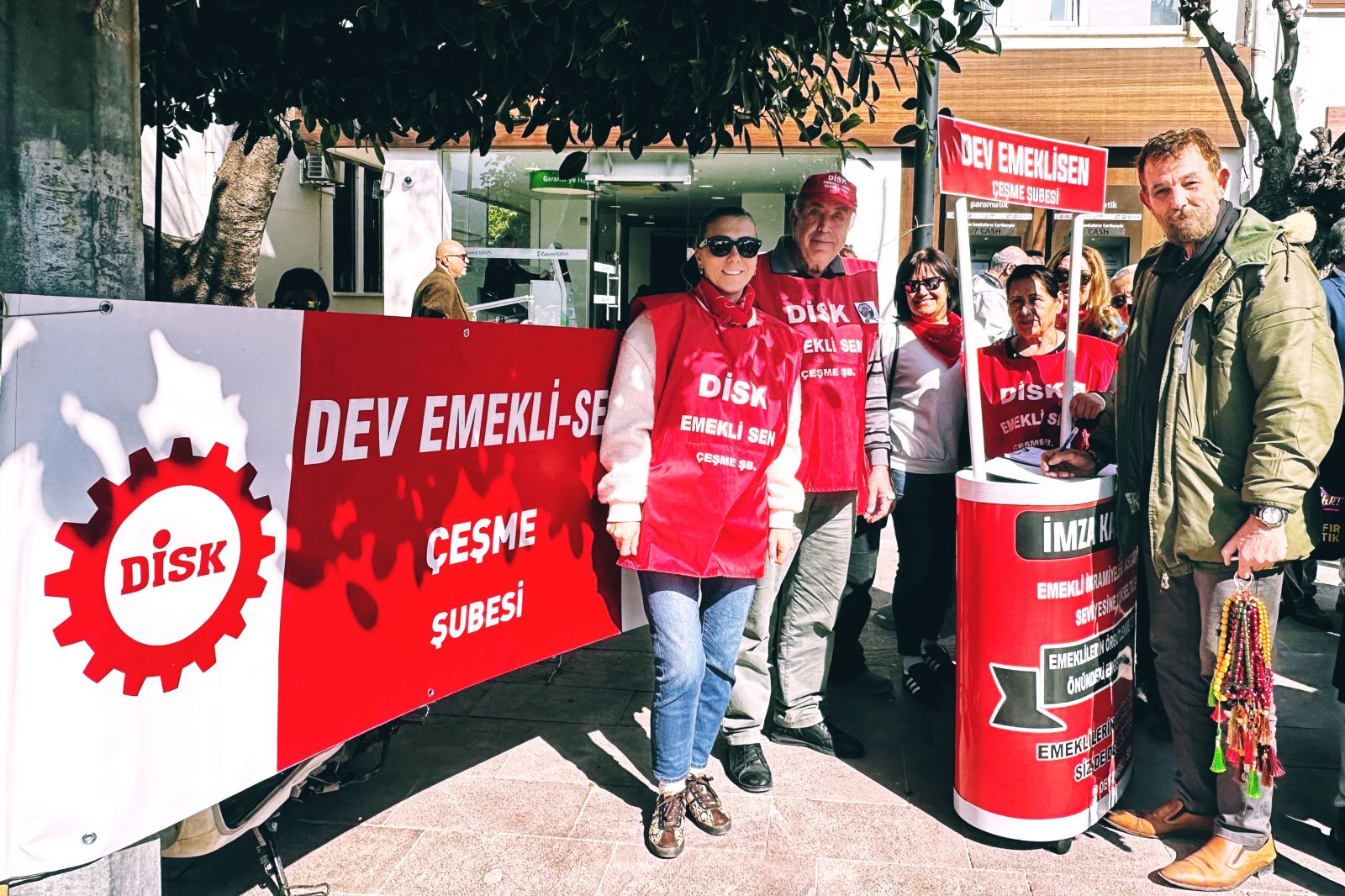 DİSK Devrimci Emekliler Sendikası Çeşme Şubesi, 3–6 Mart 2026 tarihleri arasında (5 gün) sürecek imza kampanyasını Cumhuriyet Meydanı’nda kurduğu stantta başlattı. Kampanya kapsamında toplanan imzaların, emeklilerin bayram ikramiyelerinin asgari ücret seviyesine çekilmesi ve emeklilerin sendikal örgütlenmesinin önündeki engellerin kaldırılması talebiyle TBMM’ye sunulacağı belirtildi.