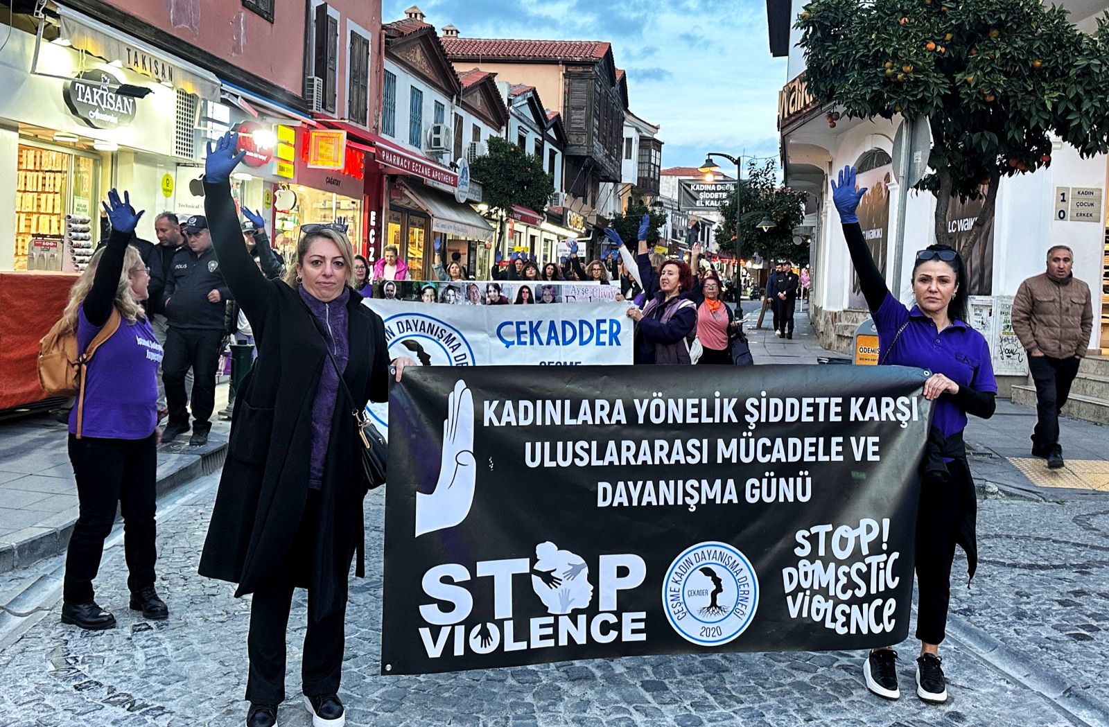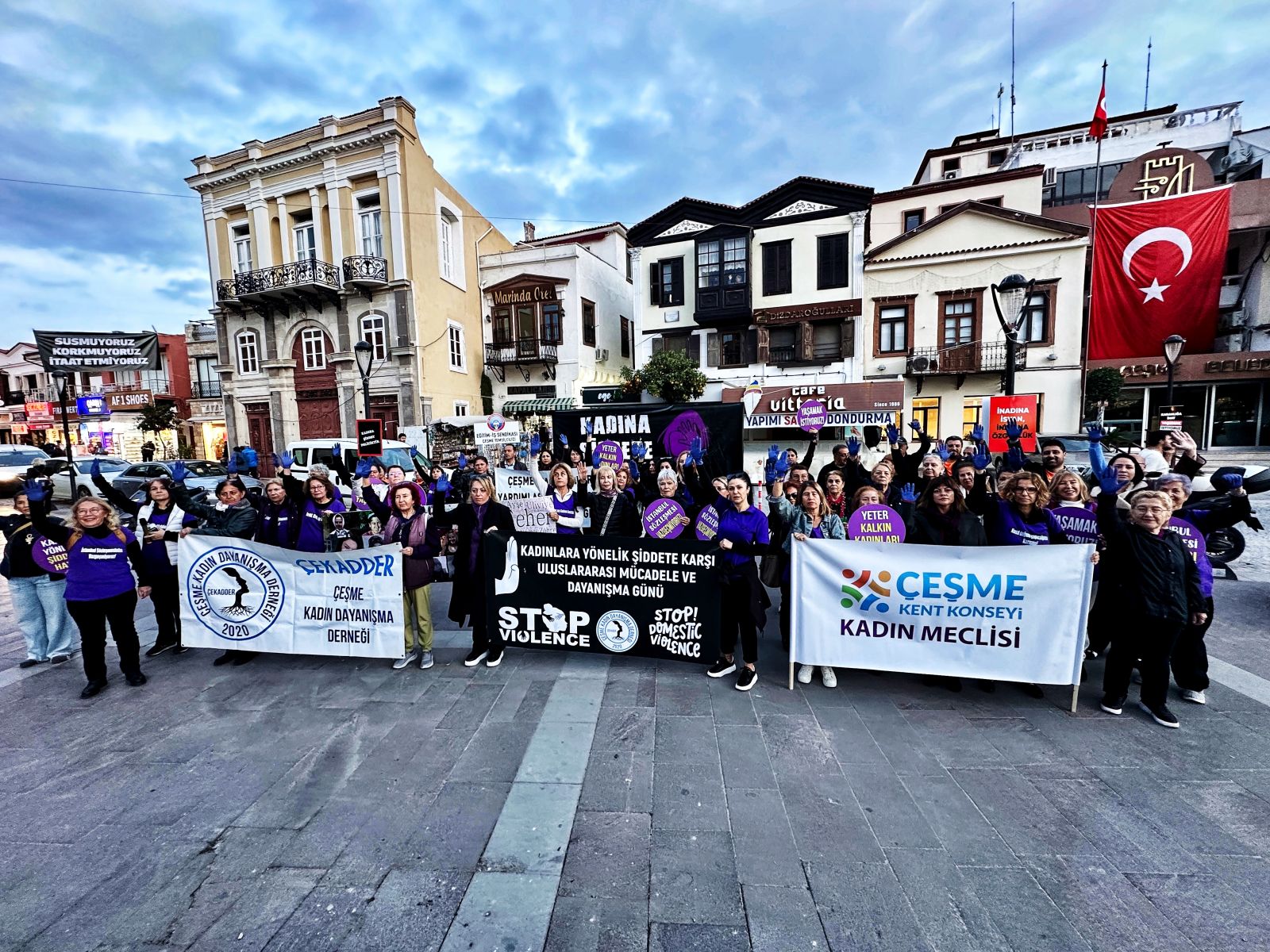 25 Kasım Kadına Yönelik Şiddete Karşı Uluslararası Mücadele Günü kapsamında Çeşme’de kadınlar, şiddete karşı seslerini duyurmak için bir araya geldi. Çeşme Kadın Dayanışma Derneği ile Çeşme Kent Konseyi Kadın Meclisi’nin çağrısıyla toplanan kadınlar, kadın hakları mücadelesinin sembolü mor kıyafetleriyle Mehmetçik Parkı’ndan Cumhuriyet Meydanı’na yürüdü. Ellerinde öldürülen kadınların fotoğraflarının yer aldığı pankartları taşıyan kadınlar, kortej boyunca sloganlarla şiddete karşı birlik ve dayanışma mesajı verdi. Meydandaki programa geçilmeden önce, kadın cinayetlerinde yaşamını yitiren kadınlar için bir dakikalık saygı duruşunda bulunuldu.