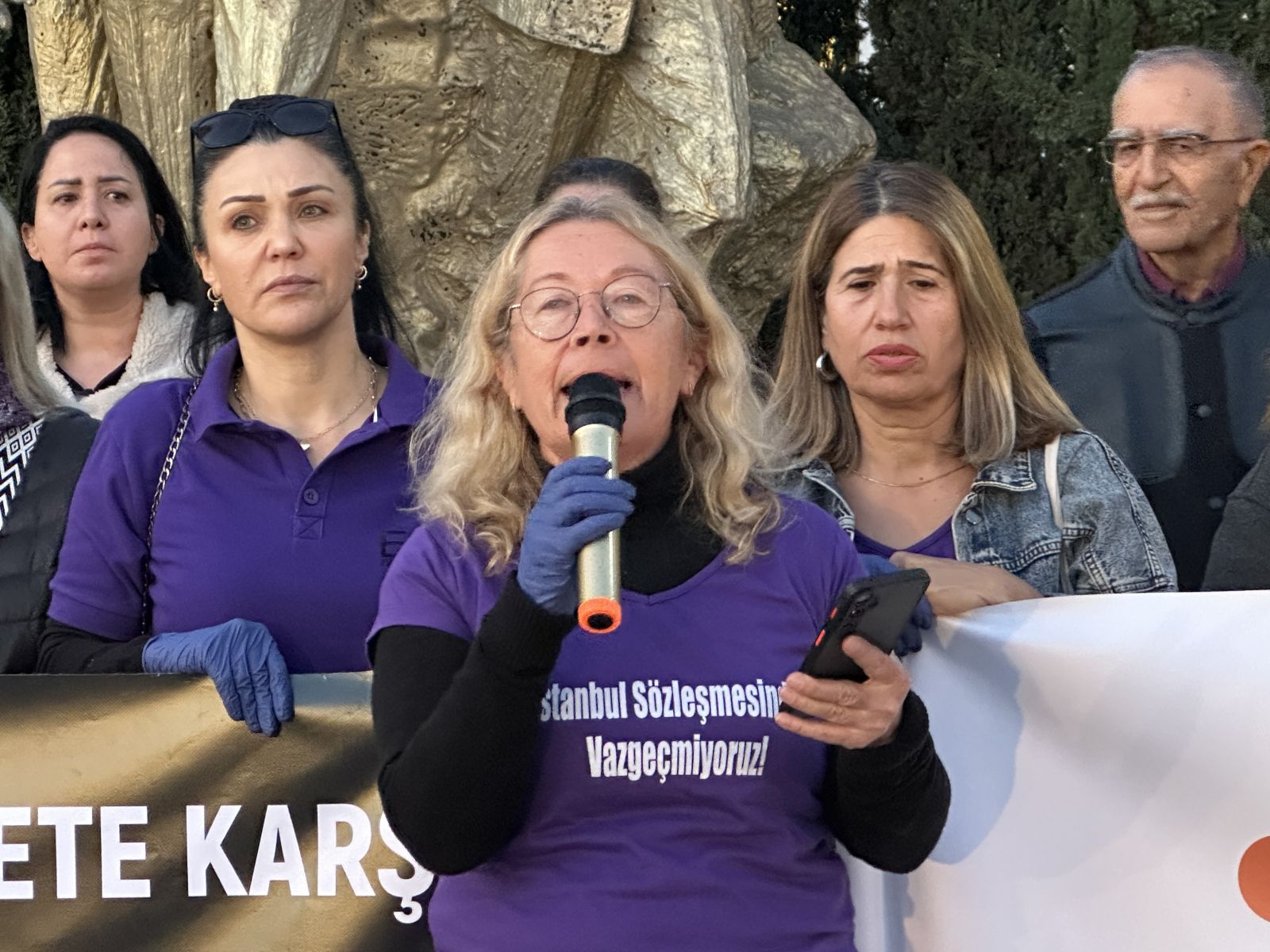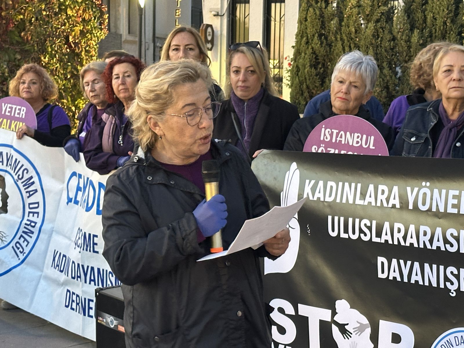 Cumhuriyet Meydanı’ndaki ilk konuşmayı Çeşme Kadın Dayanışma Derneği Başkanı Nermin Ekinci yaptı. Kadına yönelik şiddetin bireysel bir mesele değil, açık bir insan hakları ihlali olduğunu vurgulayan Ekinci, şunları söyledi: