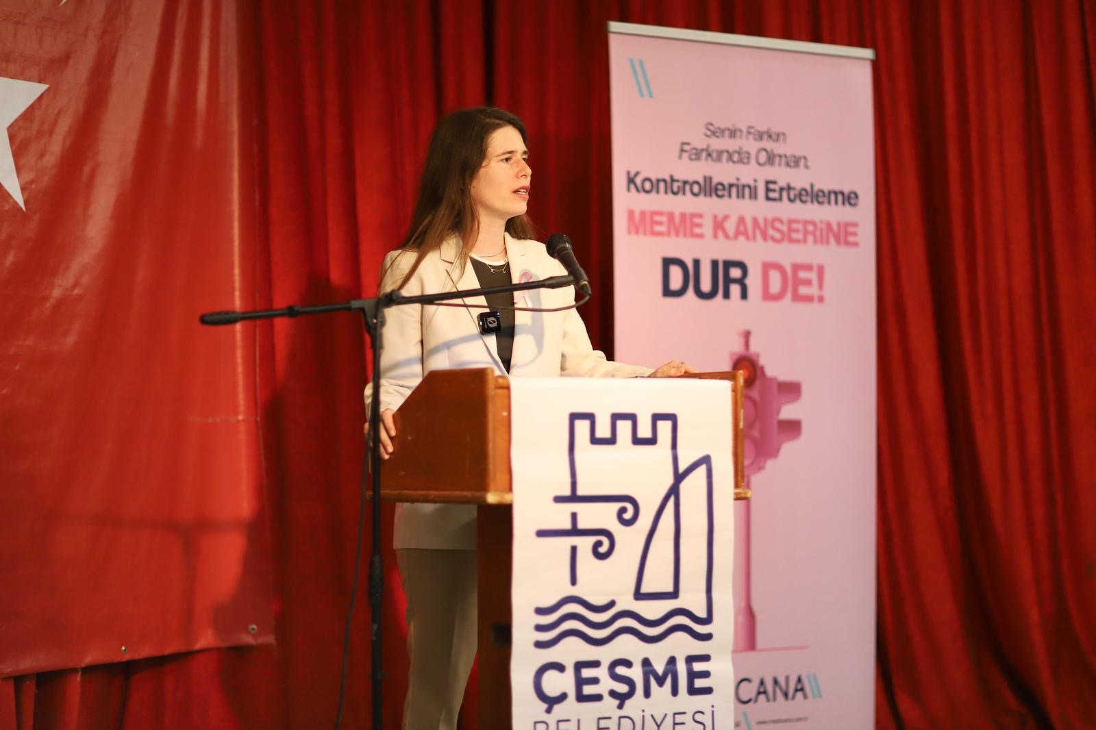 1-31 Ekim Meme Kanseri Farkındalık Ayı kapsamında Çeşme Belediyesi ve Medicana iş birliği ile Erken Tanı Hayat Kurtarır semineri düzenlendi. Seminere Çeşme Belediye Başkanı Lâl Denizli’nin yanı sıra CHP İlçe Kadın Kolları Başkanı Derya Atalan, Medicana Başhekimi Hüseyin Tayfun Çağlayan ve Op. Dr. Erol Olcaş ile çok sayıda kadın katıldı.