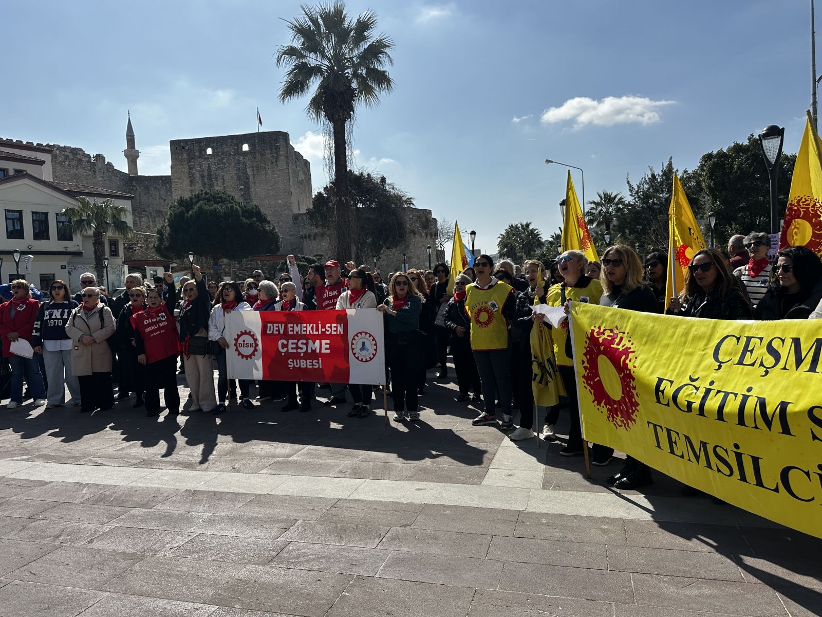 Çeşme Cumhuriyet Meydanı’nda düzenlenen açıklamaya çok sayıda öğretmenin yanı sıra Çeşme’de faaliyet gösteren sivil toplum kuruluşlarının temsilcileri ve vatandaşlar katıldı.