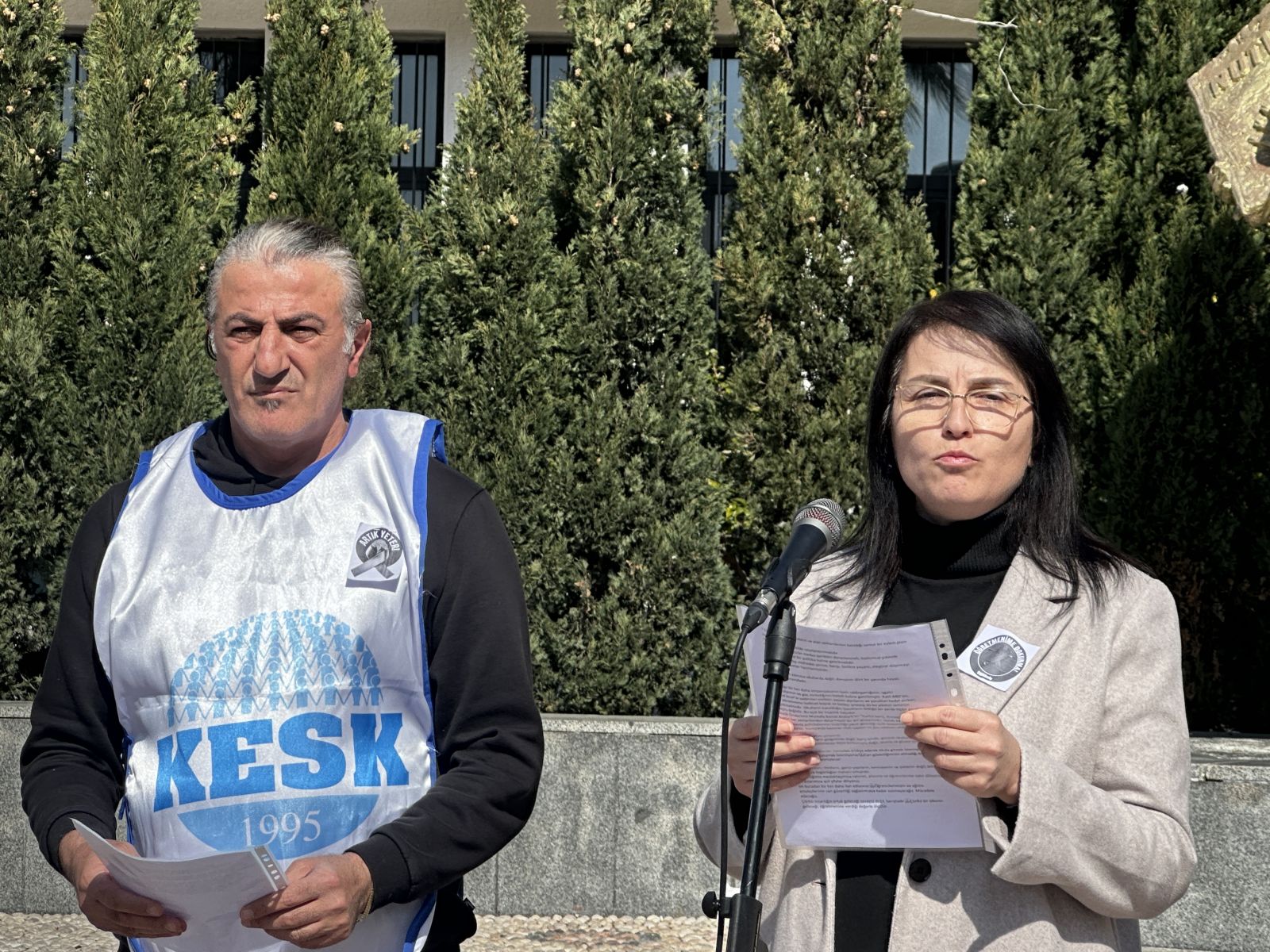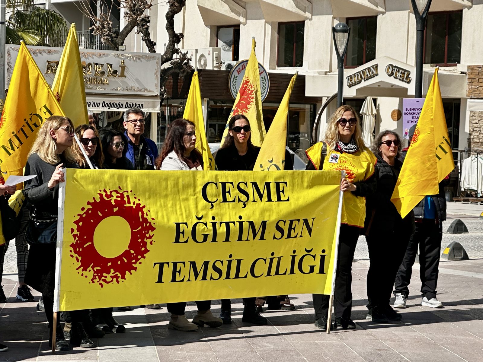 Ortak açıklama, Eğitim-Sen Çeşme Şubesi Yönetim Kurulu adına Mehmet Nuri Aras ve Eğitim-İş Çeşme Şube Başkanı Demet Özer tarafından yapıldı.