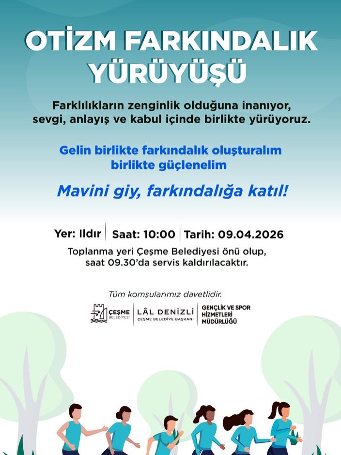 Çeşme Belediyesi, otizme yönelik toplumsal farkındalığı artırmak amacıyla anlamlı bir etkinliğe imza atıyor. 9 Nisan 2026 tarihinde Ildır’da düzenlenecek “Otizm Farkındalık Yürüyüşü” ile sevgi, anlayış ve kabulün önemine dikkat çekilecek.