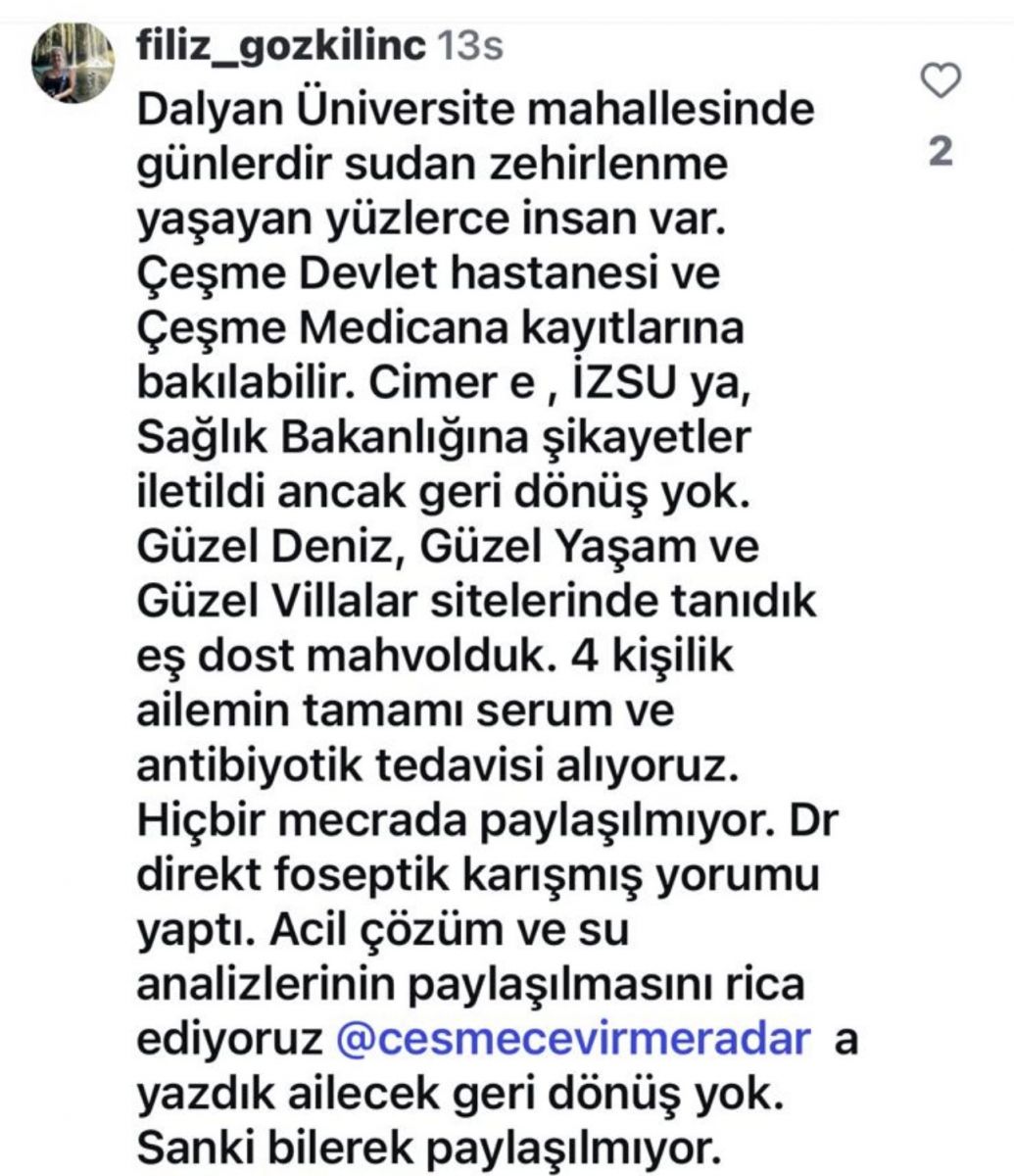 Çeşme’nin Dalyan ve Cumhuriyet mahallelerinde, şebeke suyuna kanalizasyon karıştığı iddiası ilçede endişeye neden oldu. İddiaya göre özellikle Dalyanköy ve çevresindeki sokaklarda şebeke suyunu kullanan çok sayıda kişi, ishal, ateş ve kusma şikayetleriyle hastanelere başvurdu.
