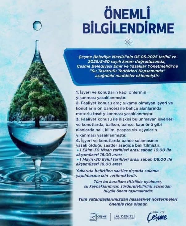 Çeşme Belediyesi, su kaynaklarının sürdürülebilirliği için tüm vatandaşlardan alınan kararlara titizlikle uymalarını istedi.