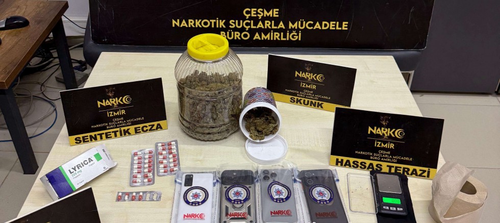 İzmir’in Çeşme, Karaburun ve Seferihisar ilçelerinde, uyuşturucu satıcılarına yönelik düzenlenen operasyonlarda 2 şüpheli tutuklandı. Operasyonlarda, yaklaşık 9 kilo esrar-skank ile çok sayıda uyuşturucu madde ve üretim ekipmanı ele geçirildi.