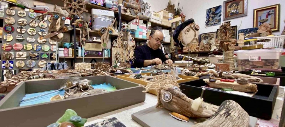 İzmir’in Çeşme ilçesinde 33 yıl esnaflık yapan 64 yaşındaki Nihat Atagöz, deniz kıyısından topladığı odun, taş ve metal parçalarını sanata dönüştürüyor. Karikatür, heykel ve mozaiği bir araya getiren Atagöz’ün eserleri, dünyanın dört bir yanına ulaşıyor.