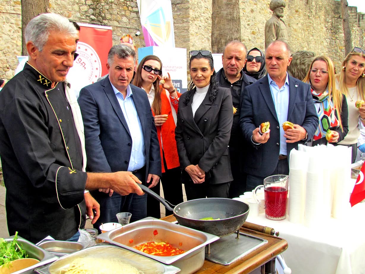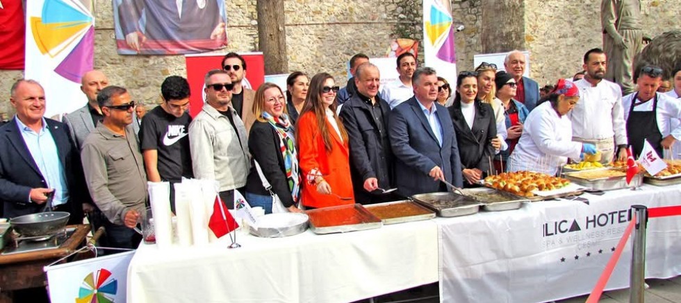 1 Kasım Cumartesi günü Çeşme Kalesi önünde düzenlenen gastronomi etkinliği, renkli görüntülere sahne oldu. Gastronomi Eğitmeni Aziz Yoldaş, deniz mahsullü makarna, antik dönem kabak yemeği ve Germiyan Mahallesi’nin ünlü yemeği Çalkama’nın yapımını katılımcılara uygulamalı olarak anlattı. Hazırlanan yemekler, Ilıca Otel’in özel atıştırmalıkları ve Reyhan Şerbeti eşliğinde ikram edildi. İzmir İl Kültür ve Turizm Müdürü Sadık Doğruer, “Merkez dışındaki etkinliklerin en dolu geçtiği ilçe Çeşme oldu” dedi.