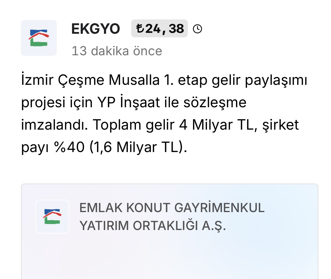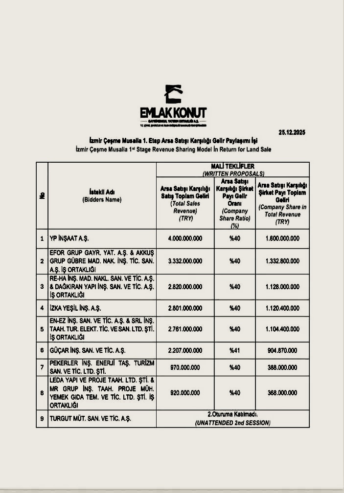 Çeşme’nin Musalla Mahallesi’nde bulunan 1. Etap arsa için düzenlenen “arsa satışı karşılığı gelir paylaşımı” ihalesi tamamlandı. Emlak Konut GYO tarafından gerçekleştirilen ihaleyi, en yüksek teklifi veren YP İnşaat A.Ş. kazandı. Taraflar arasında sözleşme imzalanırken, ihale sonucu Kamuyu Aydınlatma Platformu’na (KAP) bildirildi.