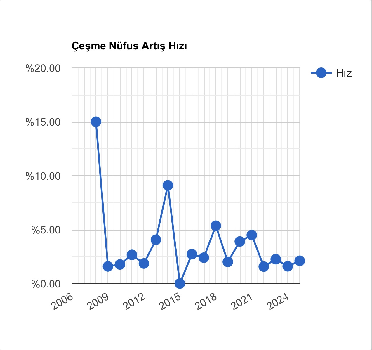 2007 yılında 27 bin 796 olan Çeşme nüfusu, aradan geçen 18 yılda yaklaşık %86 oranında bir artış sergiledi. Özellikle 2014 ve 2015 yıllarında nüfusun 39 bin 243 rakamında sabit kalması istatistiksel bir tesadüf olarak kayıtlara geçerken, 2023 yılı itibarıyla 50 bin sınırının aşılması ilçenin gelişiminde yeni bir dönemi başlattı.