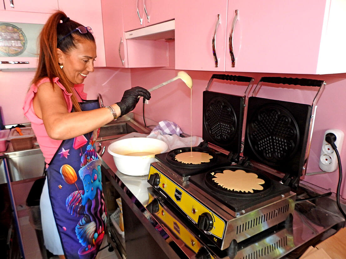Çeşme Halk Eğitim Merkezi’nin arka sokağında hizmete giren “Çeşme Waffle Sandviç”, lezzet tutkunlarını bekliyor. İşletmenin sahibi Arzu Demirci, hem Çeşme’ye yerleşme hem de kendi işini kurma hayalini gerçeğe dönüştürmenin gururunu yaşıyor.