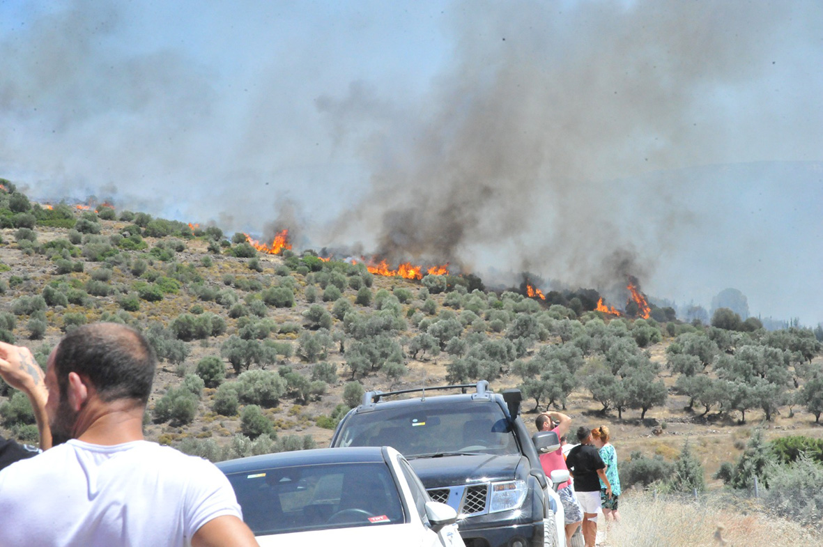 Alaçatı gişeler çıkışı Zeytinler yolunda, sağ ve sol istikametlerde saat 14.00 sıralarında çıkan yangın giderek büyüyor. Çıkan yangının çeşme otobanında bir otomobilin yanması sonucu çıktığı bildirildi. Rüzgarın etkisiyle yayılma hızı artan yangın, tüm ormanlık alana yayıldı. Yangın, itfaiye ekiplerince havadan ve karadan müdahaleyle kontrol altına alınmaya çalışılıyor. Çeşme Belediye Başkanı Ekrem Oran çıkan yangının büyüklüğünü vurgulayarak yardım çağrısında bulundu. Sosyal medya hesabından yaptığı paylaşımda Oran, "Alaçatı gişelerden çıkarken sağlı sollu çok büyük bir yangın çıktı. Çeşme'de tankerle su taşıma işi yapan vatandaşlarıma sesleniyorum. İtfaiyemizin su ihtiyacını karşılamak üzere yardımınıza ihtiyacımız var. Su dolu tankerlerle Çeşme itfaiyesine yardımda bulunmanızı rica ediyorum" diye seslendi.