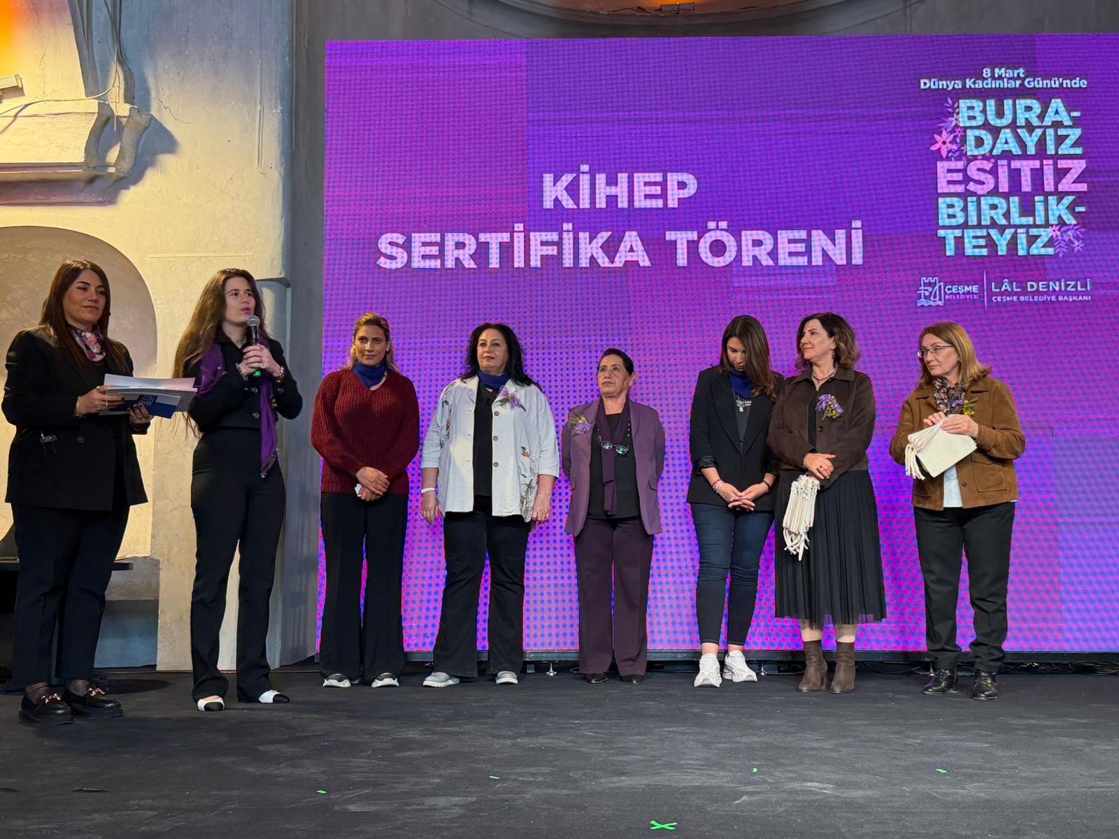 Çeşme Belediyesi’nin desteğiyle düzenlenen ve 16 hafta süren Kadının İnsan Hakları Eğitim Programı’nı (KİHEP) başarıyla tamamlayan kadınlar, sertifikalarını 8 Mart Dünya Emekçi Kadınlar Günü’nde Çeşme Belediye Başkanı Lal Denizli’nin elinden aldı.
