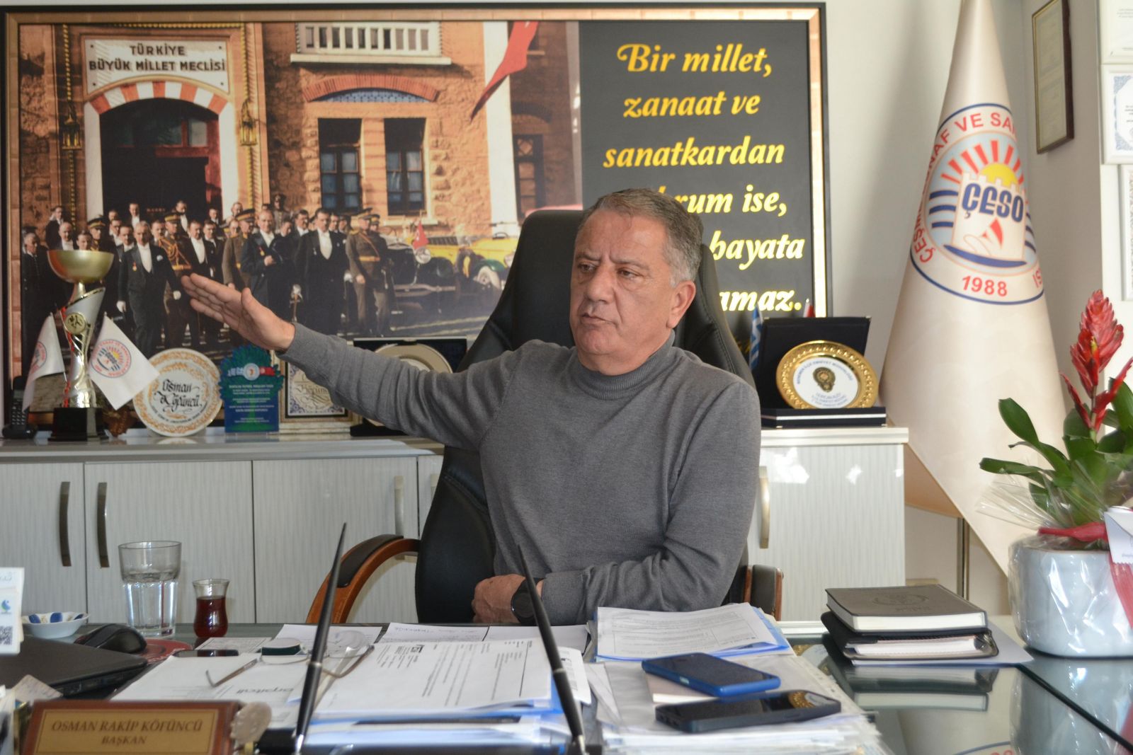 “Bu esnaf teşkilatı dualı bir ocaktır. Ahilik felsefesiyle olan bu ocağın dizayn edilmesi kolay değildir. Bir kez daha esnaf teşkilatıma, sanatkârıma sonsuz teşekkür ediyorum. Çeşme’yi dizayn etmeye çalışanlar benim muhatabım olamaz.”