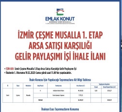 Emlak Konut Gayrimenkul Yatırım Ortaklığı (GYO), İzmir’in Çeşme ilçesi Musalla Mahallesi’nde yer alan 1. Etap arsası için ihaleye çıkıyor. Toplam 54 bin 335 metrekarelik alanı kapsayan ihale, arsa satışı karşılığı gelir paylaşımı modeliyle gerçekleştirilecek. İhalenin ilk oturumu 19 Aralık 2025 Cuma günü saat 11.00’de yapılacak.