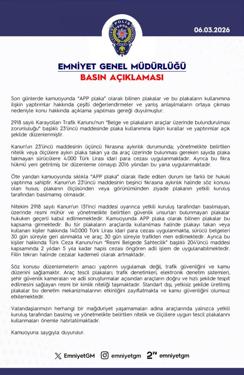 “Son günlerde kamuoyunda ‘APP plaka’ olarak bilinen plakalar ve bu plakaların kullanımına ilişkin yaptırımlar hakkında çeşitli değerlendirmeler ve yanlış anlaşılmaların ortaya çıkması nedeniyle konu hakkında açıklama yapılması gereği duyulmuştur.