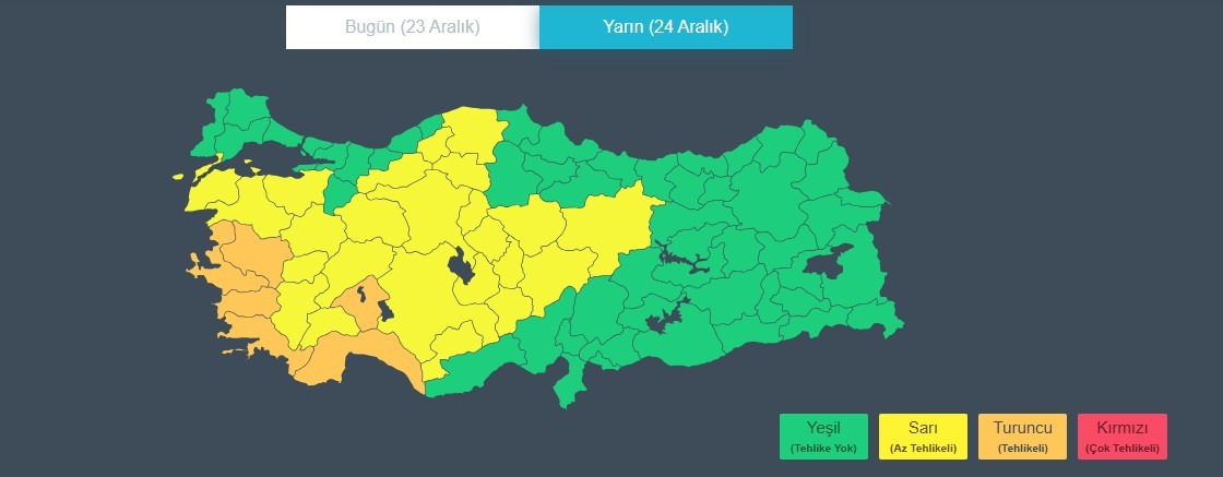 AFAD'dan yapılan açıklamaya göre 24 Aralık Salı günü, "Muğla'da şiddetli ve yer yer aşırı, İzmir, Manisa, Denizli, Uşak ve Kütahya çevrelerinde kuvvetli, Aydın çevreleri, İzmir'in iç kesimleri ile Manisa'nın güney kesimlerinde yer yer çok kuvvetli, Isparta çevreleri, Burdur’un doğusu ve Konya’nın güneybatısında çok kuvvetli ve yer yer şiddetli sağanak ve gök gürültülü sağanak yağış bekleniyor" ifadeleri yer aldı.