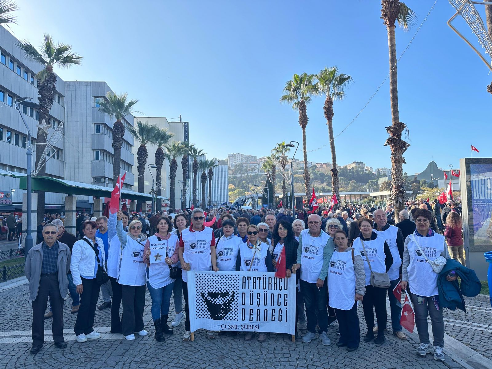 Çeşme Atatürkçü Düşünce Derneği, teğmenlere destek etkinliğine yoğun katılım sağlayarak dayanışmanın en güzel örneğini sergiledi. ADD üyeleri, alana “Mustafa Kemal’in Askerleriyiz” sloganları eşliğinde giriş yaparak, genç teğmenlere desteklerini ifade etti.