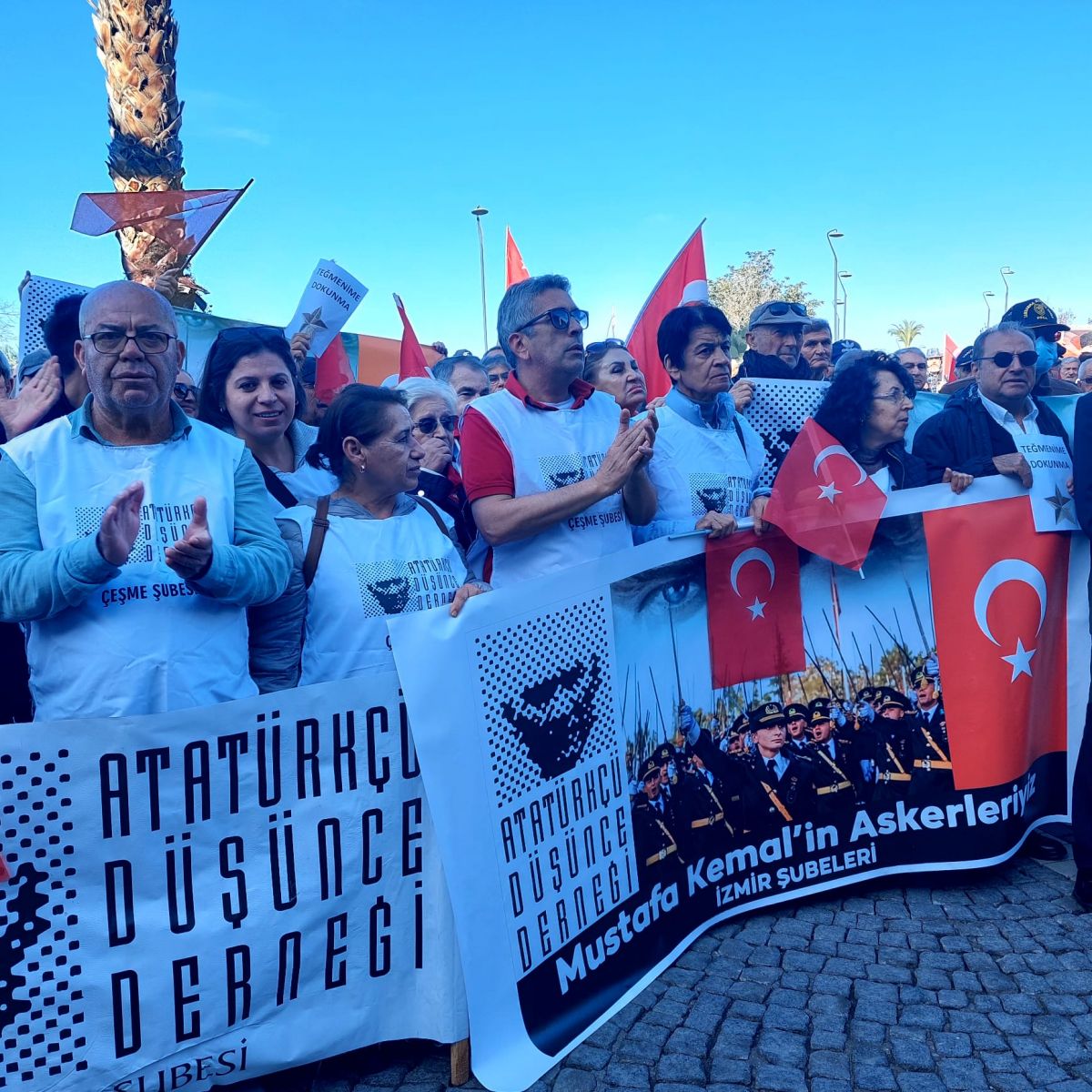 Kara Harp Okulu mezuniyet töreninde “Mustafa Kemal’in Askerleriyiz” sloganı atan teğmenlerin disipline sevk edilmesi ve ihraç talebine yönelik tepkiler büyüyor. Türkiye genelinde emekli askerler, sivil toplum kuruluşları (STK) ve vatandaşlar, teğmenlere destek için meydanlarda buluştu. Çeşme ADD’ de yoğun katılımla destek verdi.