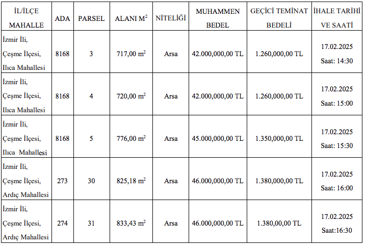 İhale, 17 Şubat’ta Çeşme Belediyesi Ana Hizmet Binası Meclis Salonu’nda saat 14:30’da başlayıp 16:30’da sona erecek. Öte yandan, arsaların satışlarının yapılacağı ihale kapalı teklif usulüyle gerçekleşecek.