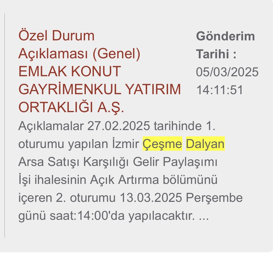 İzmir Çeşme Dalyan bölgesinde düzenlenen arsa satışı karşılığı gelir paylaşımı ihalesinin ikinci oturumu, 13 Mart 2025 Perşembe günü saat 14.00’te yapılacak. Emlak Konut Gayrimenkul Yatırım Ortaklığı A.Ş. tarafından düzenlenen ihalede, dünyaca ünlü Aya Yorgi Koyu’nda yapılaşma için 20 şirket yarışacak.