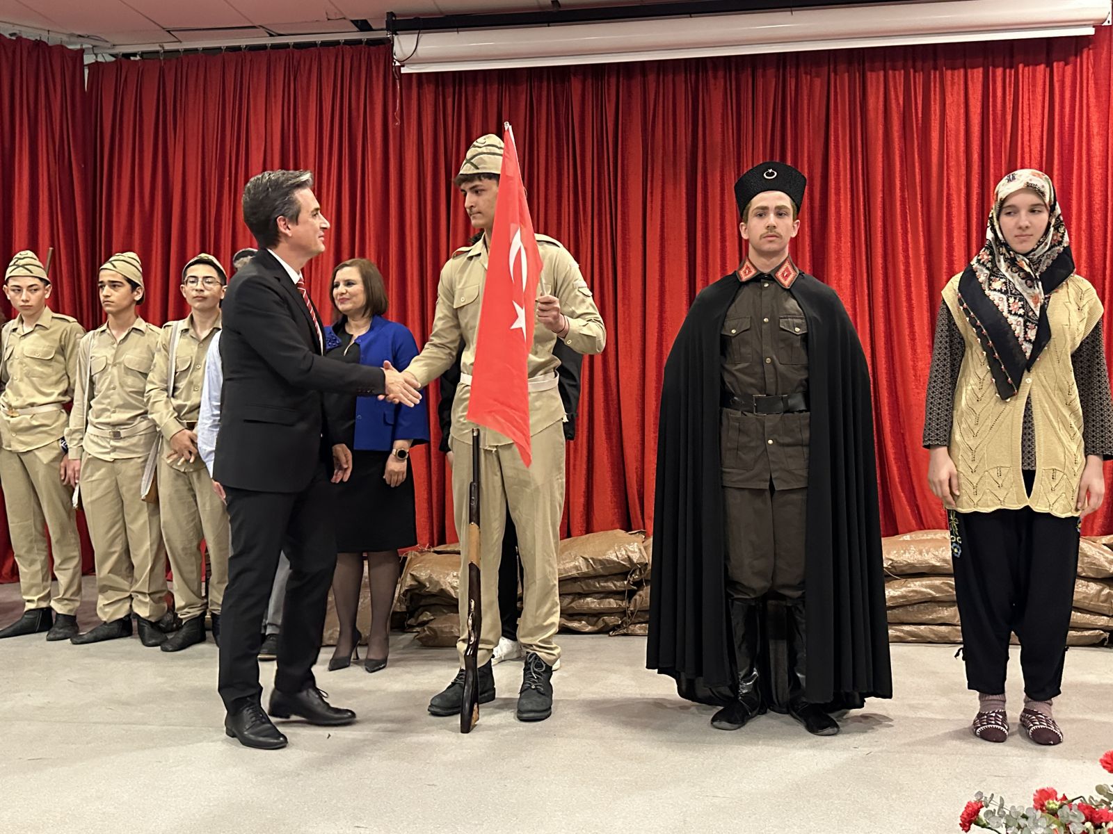 Törenin en anlamlı bölümlerinden biri ise öğrencilerin sahnelediği “1915’ten 2025’e Saygı” ve “Çanakkale Destanı” adlı tiyatro gösterisi oldu. Büyük beğeni toplayan gösterinin ardından, öğrenciler kısa süre önce gerçekleştirdikleri Çanakkale Şehitliği gezisinden getirdikleri toprakları, Kaymakam Mehmet Maraşlı ve Başkan Vekili Onur Saatli’ye takdim etti.