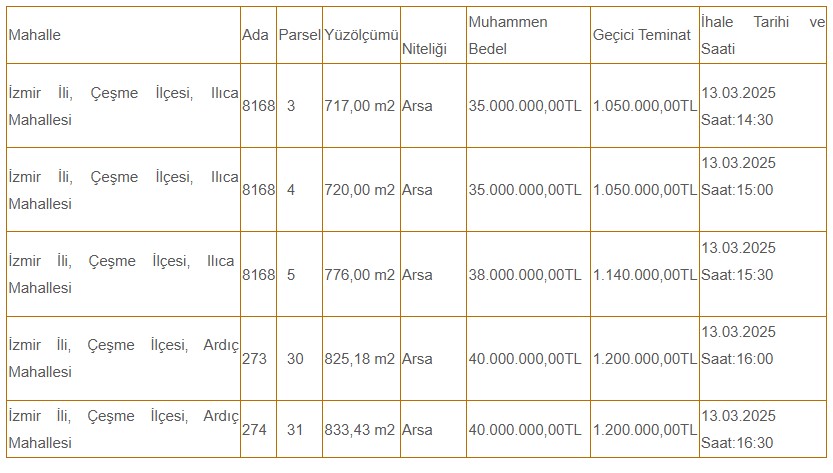 Çeşme’nin Ilıcı mahallesinde 3, Ardıç mahallesinde 2 olmak üzere arsa niteliğindeki taşınmazlar satılacak.