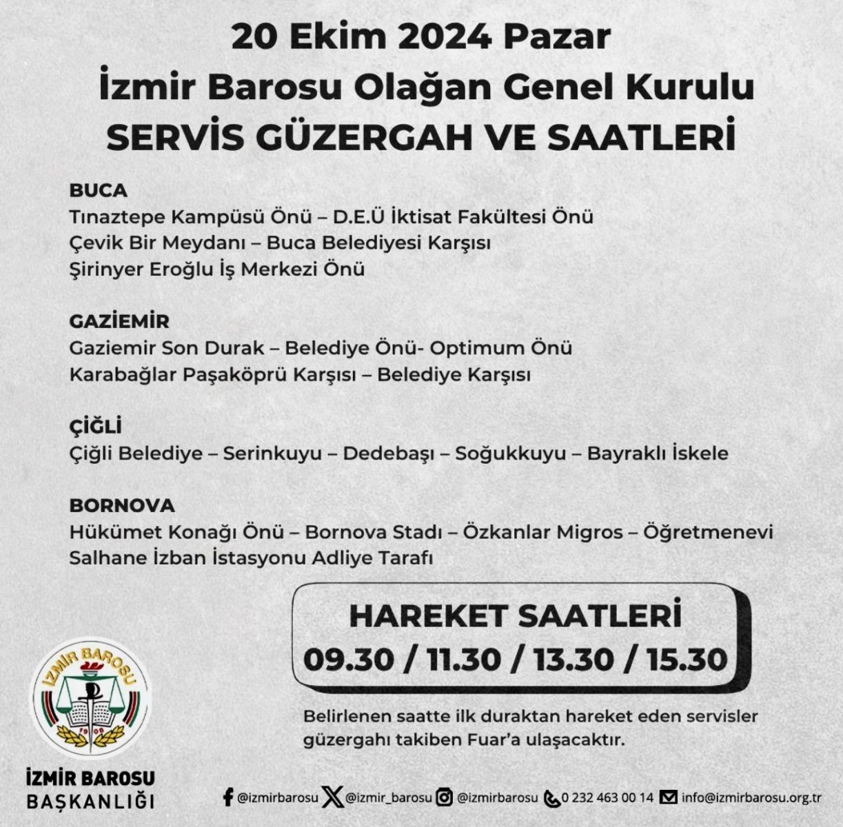 İzmir Barosu ayrıca Olağan Genel Kurulu için belirlenen güzergahlarda servis kaldıracak.