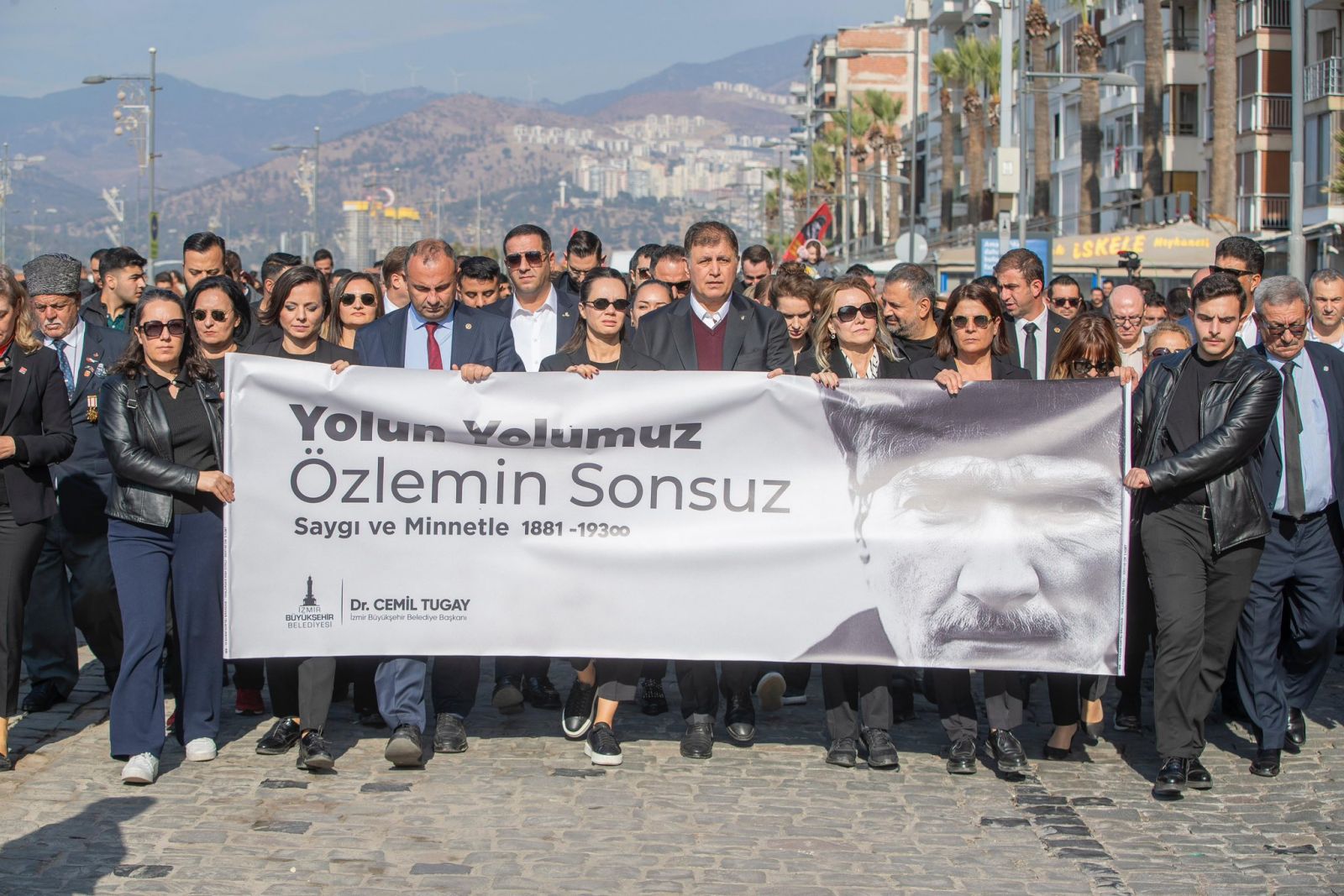 Atatürk’ü anma etkinlikleri sabah 09.05’te Cumhuriyet Meydanı’ndaki törenlerle başladı ve ardından İzmir Büyükşehir Belediyesi’nin düzenlediği “Ata’ya Saygı Yürüyüşü” ile devam etti. Alsancak Limanı’ndan Cumhuriyet Meydanı’na kadar uzanan yürüyüşte, katılımcıların taşıdığı 350 metrelik dev Atatürk posteri görkemli bir görüntü oluşturdu. Meydanda gönüllüler tarafından “İzmir Ata’sının İzinde” koreografisiyle hazırlanan yazı, yürüyüşe katılan binlerce İzmirliyi adeta tek yürek haline getirdi.