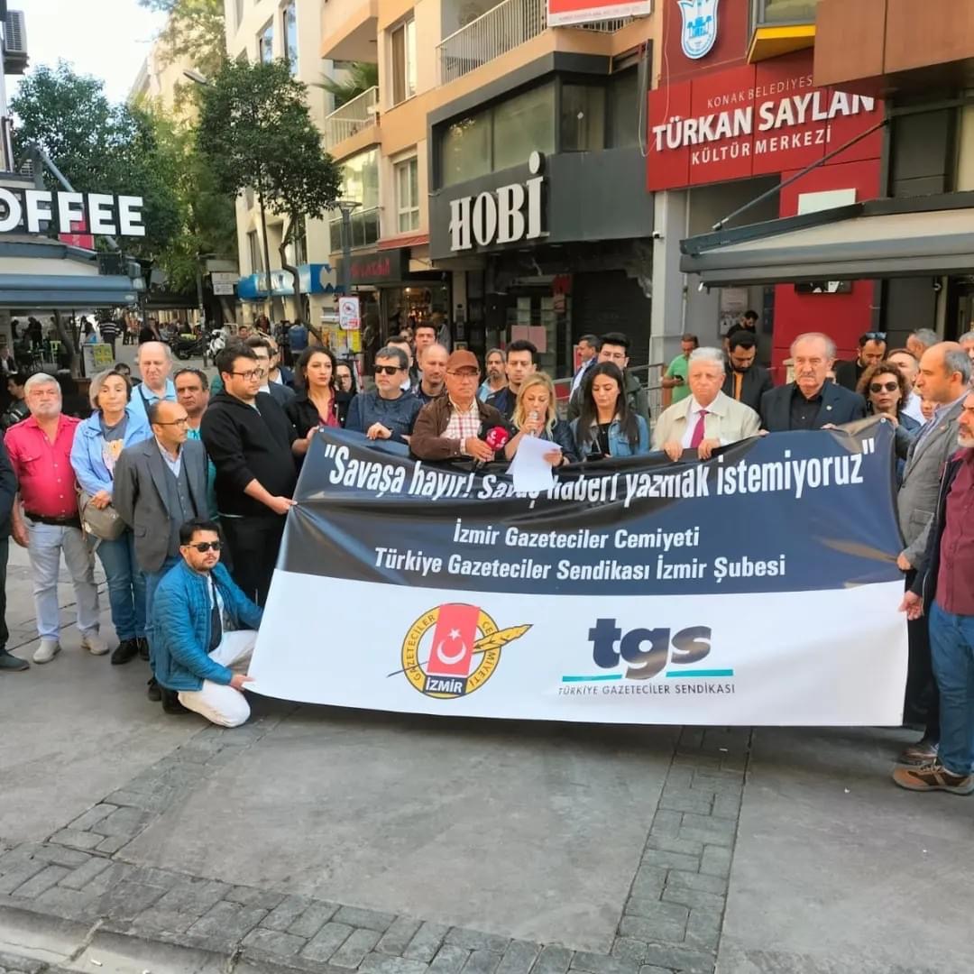 İzmir Gazeteciler Cemiyeti (İGC) ve Türkiye Gazeteciler Sendikası (TGS) İzmir Şubesi üyeleri, İsrail’in Gazze’ye yönelik saldırılarını kınamak ve gazetecilerin saldırılarda hayatını kaybetmesine tepki göstermek amacıyla Kıbrıs Şehitleri Caddesi'nde ‘İzmirli Gazeteciler Savaş İstemiyor’ sloganıyla eylem gerçekleştirdi. Eyleme İzmir Gazeteciler Cemiyeti (İGC) Yönetim Kurulu Başkanı Dilek Gappi, Türkiye Gazeteciler Sendikası (TGS) İzmir Şube Başkanı Nil Kahramanoğlu, üyeler ve basın mensupları katıldı.