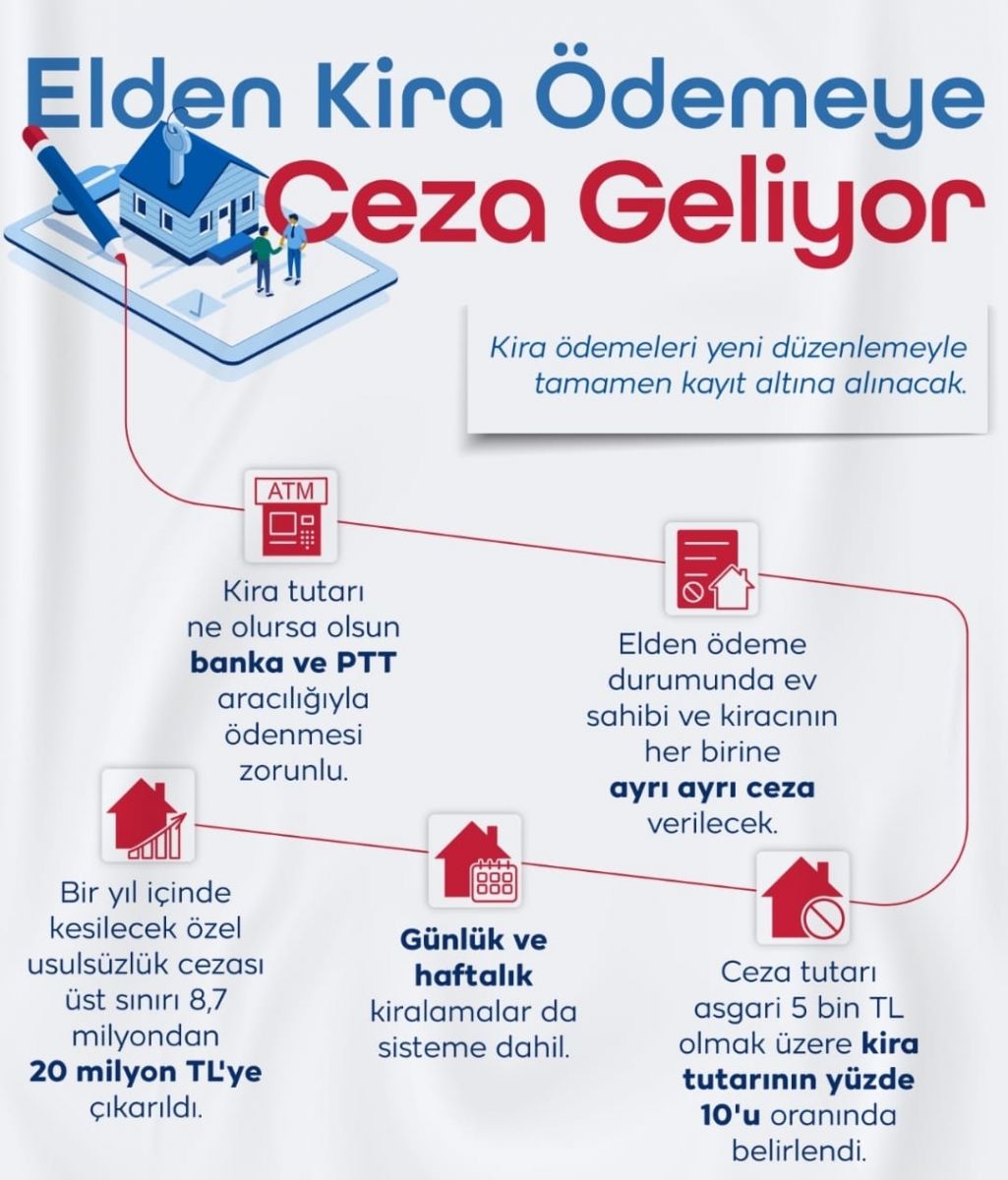 Kiracılar, ödemenin elden yapıldığını 5 iş günü içinde yetkililere bildirirse ceza uygulanmayacak. Bir takvim yılı içinde kesilecek ceza üst sınırı da 8 milyon 700 bin liradan 20 milyon liraya çıkarıldı.