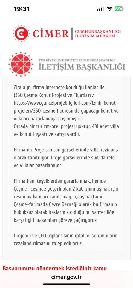 Dernek ayrıca, ilgili kurumların görevini yapmadığını belirterek Cumhurbaşkanlığı İletişim Merkezi (CİMER) üzerinden resmi şikâyette bulundu.