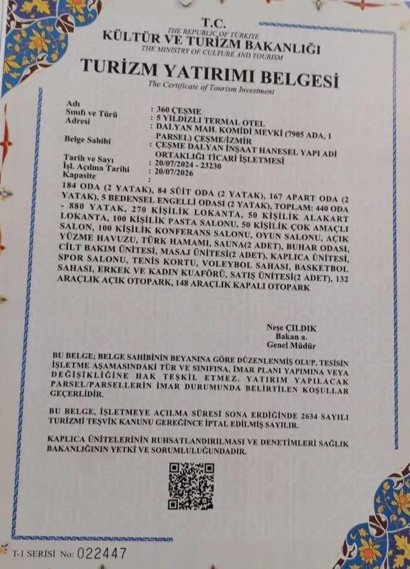 Çeşme Belediyesi’nin 14 Ocak 2025’te “5 yıldızlı otel” ruhsatı verdiği proje, kısa sürede internette “360 Çeşme Konut Projesi” adıyla villa ve daire satışlarına dönüştü. Projenin tanıtım görsellerinde suit daireler, bahçeli villalar ve özel havuzlu rezidanslar ön planda yer alıyor.