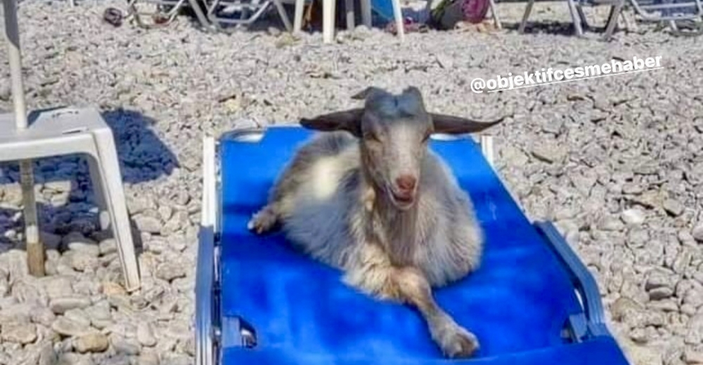 Kurban Bayramı’nın devam ettiği bu günlerde, Çeşme'de kurban olmaktan son anda kurtulan bir keçi, Çeşme Plajları'nda güneşlenirken poz verdi.