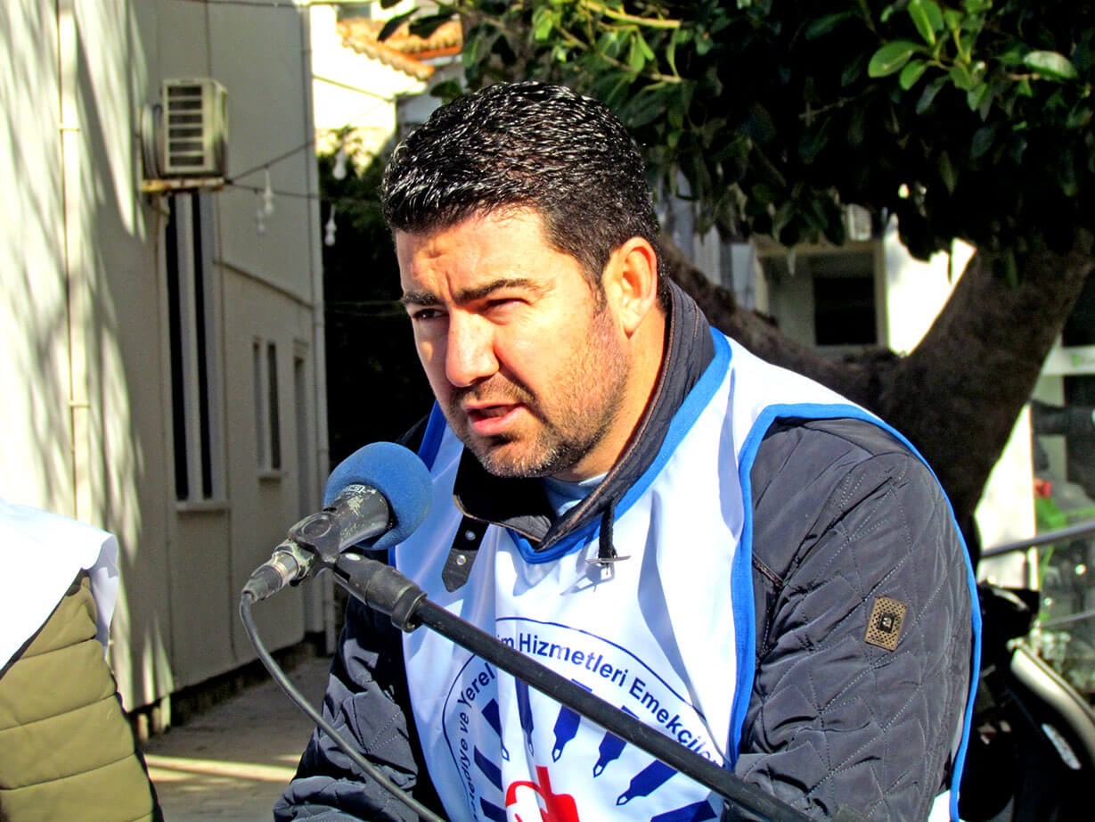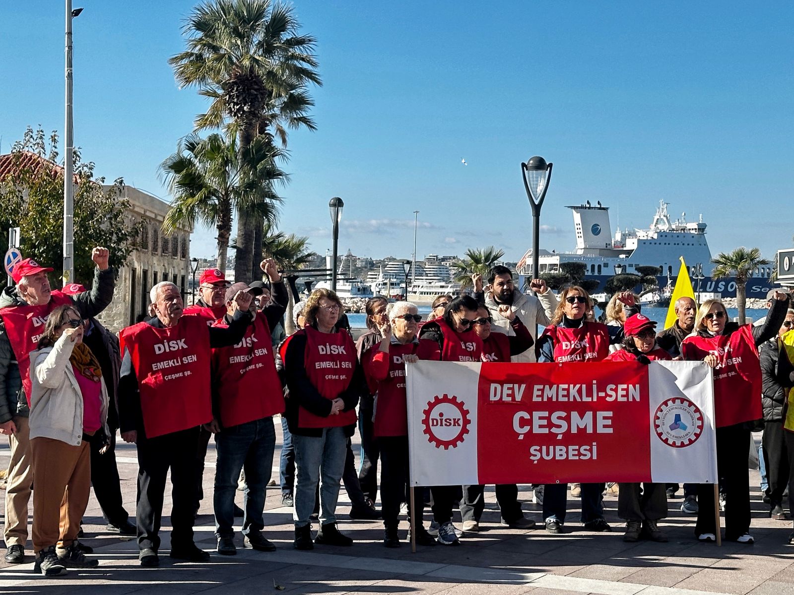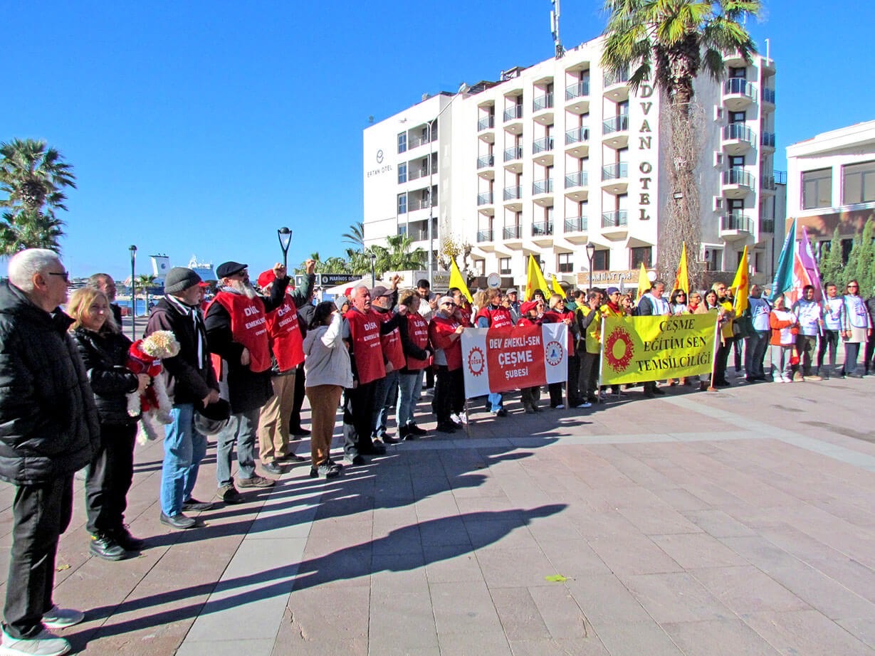 Cumhuriyet Meydanı’nda gerçekleştirilen basın açıklamasına Eğitim-Sen Çeşme Temsilciliği, Tüm Bel-Sen Çeşme Temsilciliği ve Sağlık ve Sosyal Hizmet Emekçileri Sendikası (SES) Çeşme Temsilciliği üyesi kamu emekçileri katıldı. DİSK Dev-Emekli-Sen Çeşme Temsilciliği üyeleri de eyleme destek verdi.
