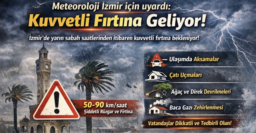 İzmir Meteoroloji 2’nci Bölge Müdürlüğü tarafından yapılan açıklamada, yarın sabah saatlerinden itibaren il genelinde kuvvetli rüzgâr ve fırtına (50–70 km/saat), yer yer ise kuvvetli fırtına (70–80 km/saat, yüksek kesimlerde 90 km/saat) beklendiği bildirildi.