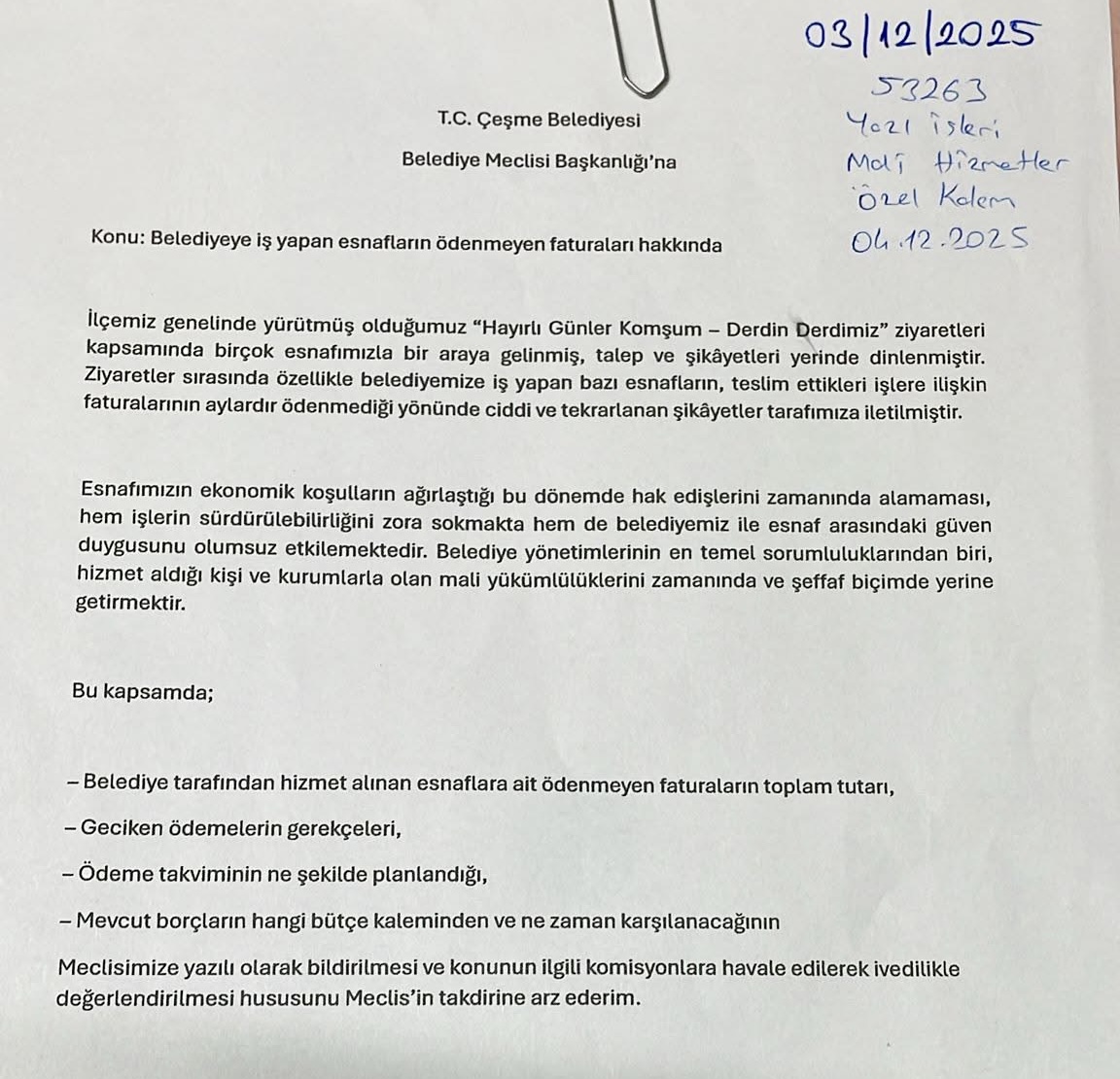 MHP’li Çeşme Belediye Meclis Üyeleri; Hakan Çalı, Yunus Emre Koç ve Ali Gölcük, 3 Aralık 2025 tarihli Çeşme Belediye Meclisi toplantısında, belediyeye iş yapan esnafın uzun süredir alamadığı ödemelerle ilgili önemli bir soru önergesi sundu. MHP Grubu, ilçede birçok esnafın aylardır bekleyen faturalar nedeniyle ciddi mağduriyet yaşadığını belirterek belediye yönetimini açıklama yapmaya çağırdı.