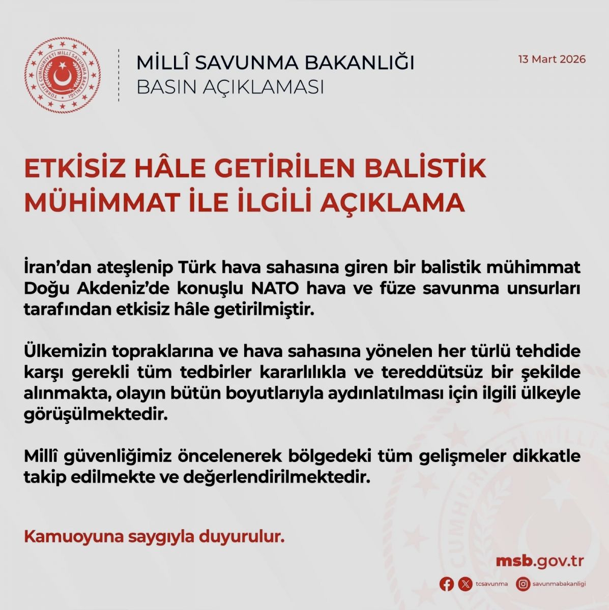 “İran’dan ateşlenip Türk hava sahasına giren bir balistik mühimmat, Doğu Akdeniz’de konuşlu NATO hava ve füze savunma unsurları tarafından etkisiz hâle getirilmiştir. Ülkemizin topraklarına ve hava sahasına yönelen her türlü tehdide karşı gerekli tüm tedbirler kararlılıkla ve tereddütsüz bir şekilde alınmakta, olayın bütün boyutlarıyla aydınlatılması için ilgili ülkeyle görüşülmektedir.”