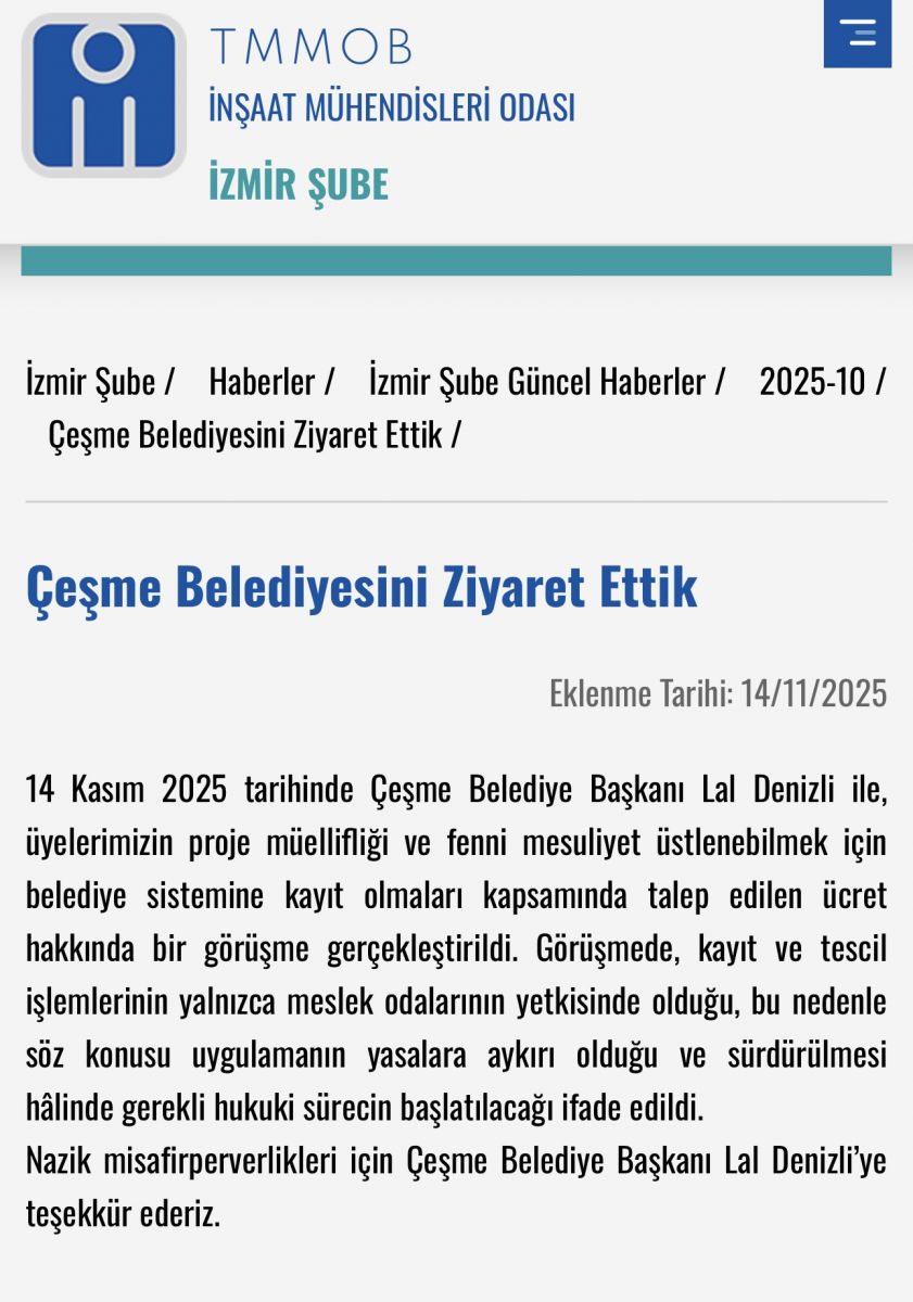 14 Kasım 2025 tarihinde Çeşme Belediye Başkanı Lal Denizli ile görüşen TMMOB temsilcileri, üyelerinin proje müellifliği ve fenni mesuliyet üstlenebilmesi için belediye sistemine kayıt olmaları sırasında talep edilen ücretin yalnızca meslek odalarının yetkisinde olduğunu vurguladı. Görüşmede, uygulamanın sürdürülmesi hâlinde yasal süreç başlatılacağı ifade edildi.
